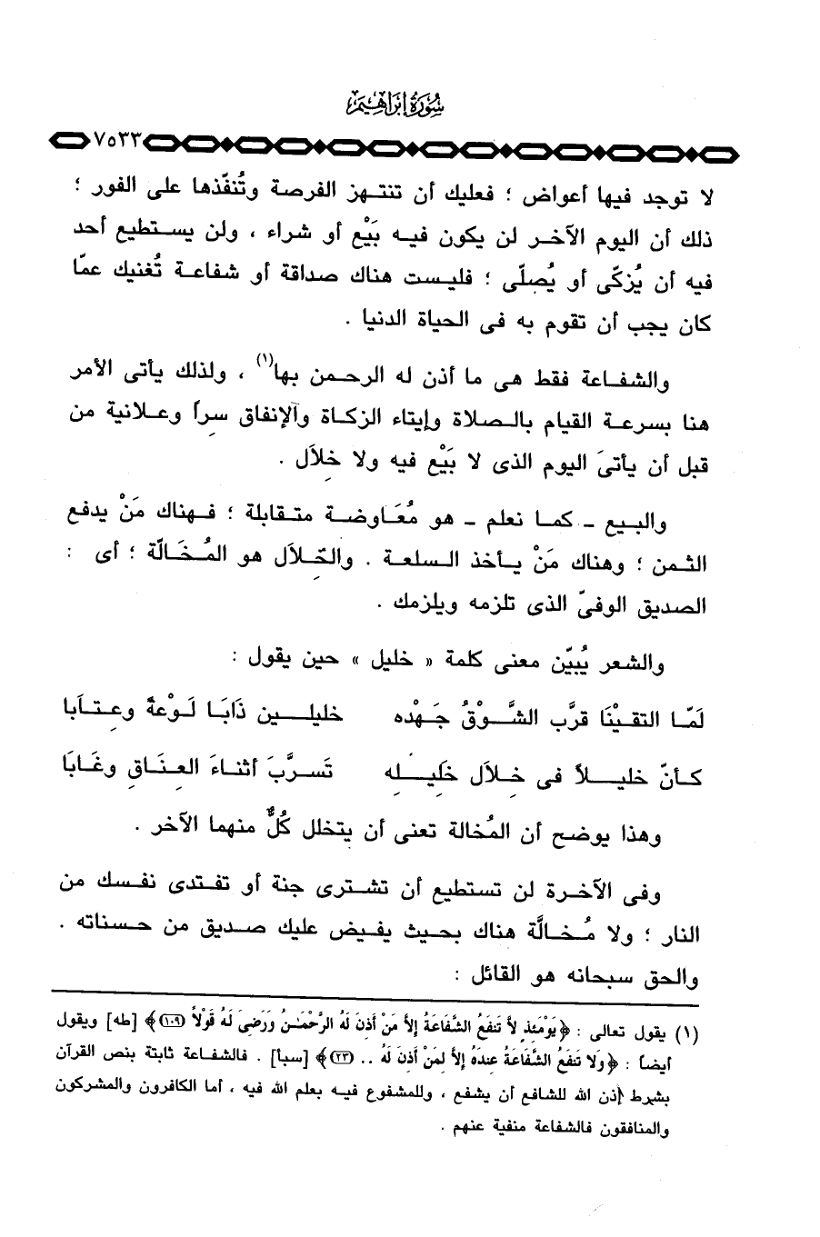 والشفاعة فقط هي ما أذن له الرحمن بها، ولذلك يأتي الأمر هنا بسرعة القيام بالصلاة وإيتاء الزكاة والإنفاق سِراً وعلانية من قبل أن يأتيَ اليوم الذي لا بَيْع فيه ولا خِلاَل.