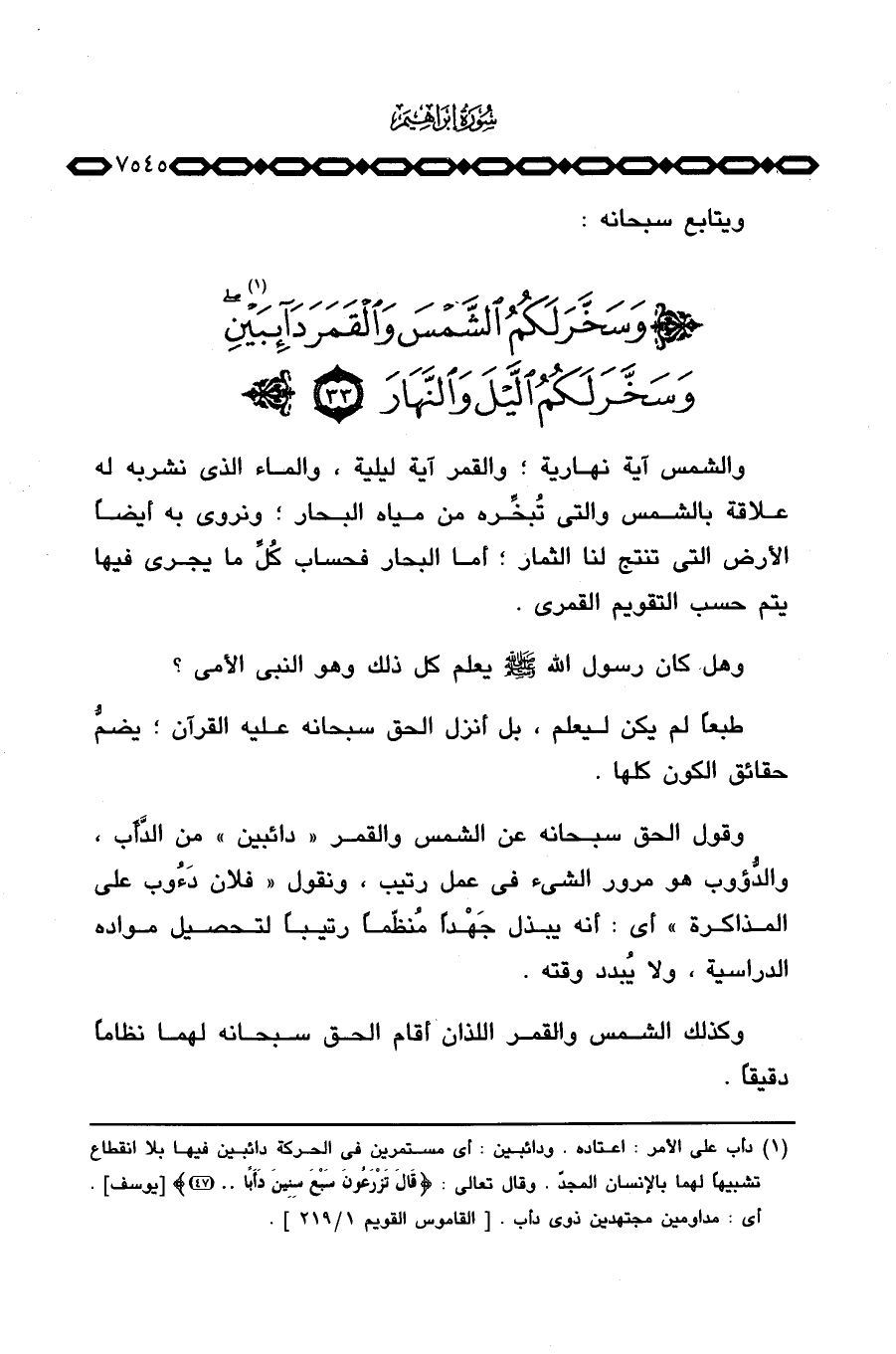 وقول الحق سبحانه عن الشمس والقمر «دائبين» من الدَّأب، والدُّؤوب هو مرور الشيء في عمل رتيب، ونقول «فلان دَءُوب على المذاكرة» أي: أنه يبذل جَهْداً مُنظّماً رتيباً لتحصيل مواده الدراسية، ولا يبُدد وقته.