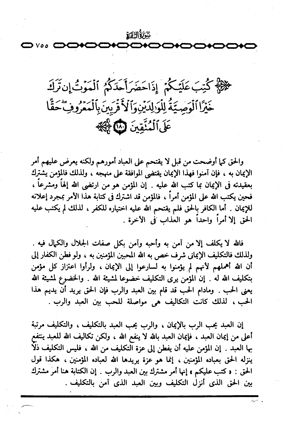 إن العبد يحب الرب بالإيمان، والرب يحب العبد بالتكليف، والتكليف مرتبة أعلى من إيمان العبد، فإيمان العبد بالله لا ينفع الله، ولكن تكاليف الله للعبد ينتفع بها العبد. إن المؤمن عليه أن يفطن إلى عزة التكليف من الله، فليس التكليف ذلا ينزله الحق بعباده المؤمنين، إنما هو عزة يريدها الله لعباده المؤمنين، هكذا قول الحق: {كُتِبَ عَلَيْكُمْ} إنها أمر مشترك بين العبد والرب. إن الكتابة هنا أمر مشترك بين الحق الذي أنزل التكليف وبين العبد الذي آمن بالتكليف.