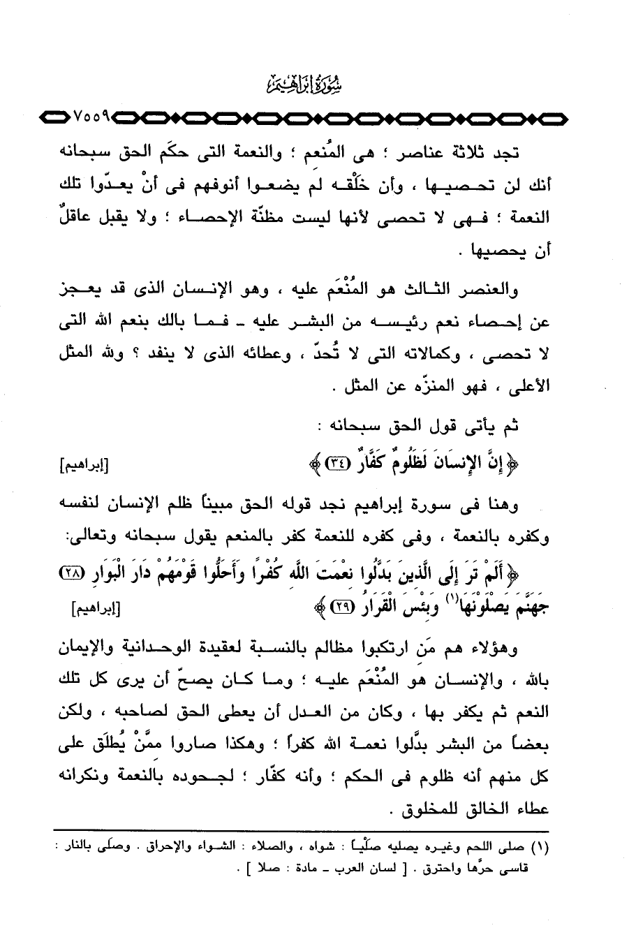 وهؤلاء هم مَنِ ارتكبوا مظالم بالنسبة لعقيدة الوحدانية والإيمان بالله، والإنسان هو المُنْعَم عليه؛ وما كان يصحّ أن يرى كل تلك النعم ثم يكفر بها، وكان من العدل أن يعطي الحق لصاحبه، ولكن بعضاً من البشر بدَّلوا نعمة الله كفراً؛ وهكذا صاروا مِمَّنْ يُطلَق على كل منهم أنه ظلوم في الحكم؛ وأنه كفّار؛ لجحوده بالنعمة ونكرانه عطاء الخالق للمخلوق.