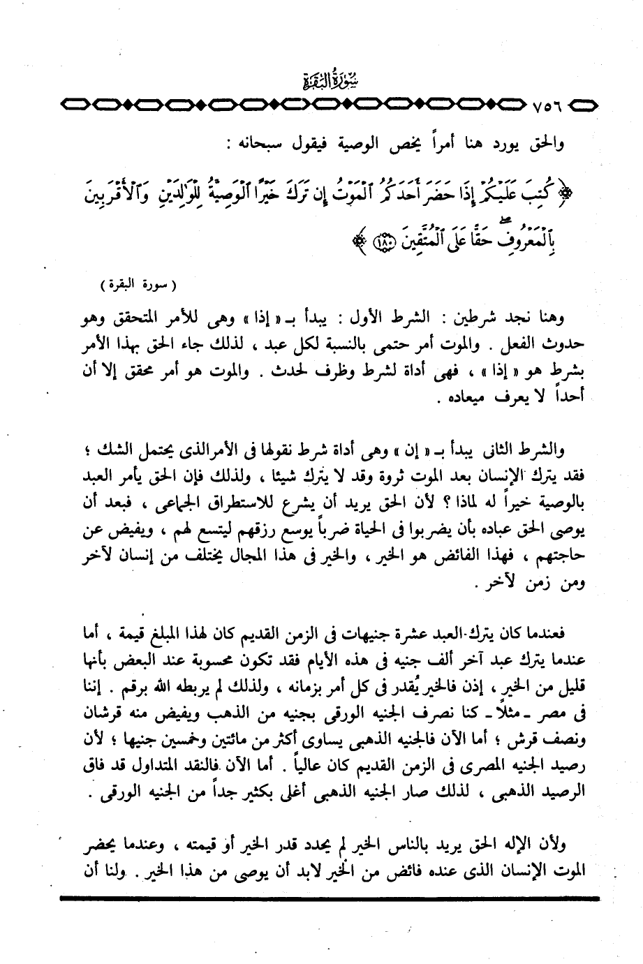 والشرط الثاني يبدأ ب {إِن} وهي أداة شرط نقولها في الأمر الذي يحتمل الشك؛ فقد يترك الإنسان بعد الموت ثروة وقد لا يترك شيئا، ولذلك فإن الحق يأمر العبد بالوصية خيراً له لماذا؟ لأن الحق يريد أن يشرع للاستطراق الجماعي، فبعد أن يوصي الحق عباده بأن يضربوا في الحياة ضرباً يوسع رزقهم ليتسع لهم، ويفيض عن حاجتهم، فهذا الفائض هو الخير، والخير في هذا المجال يختلف من إنسان لآخر ومن زمن لآخر.