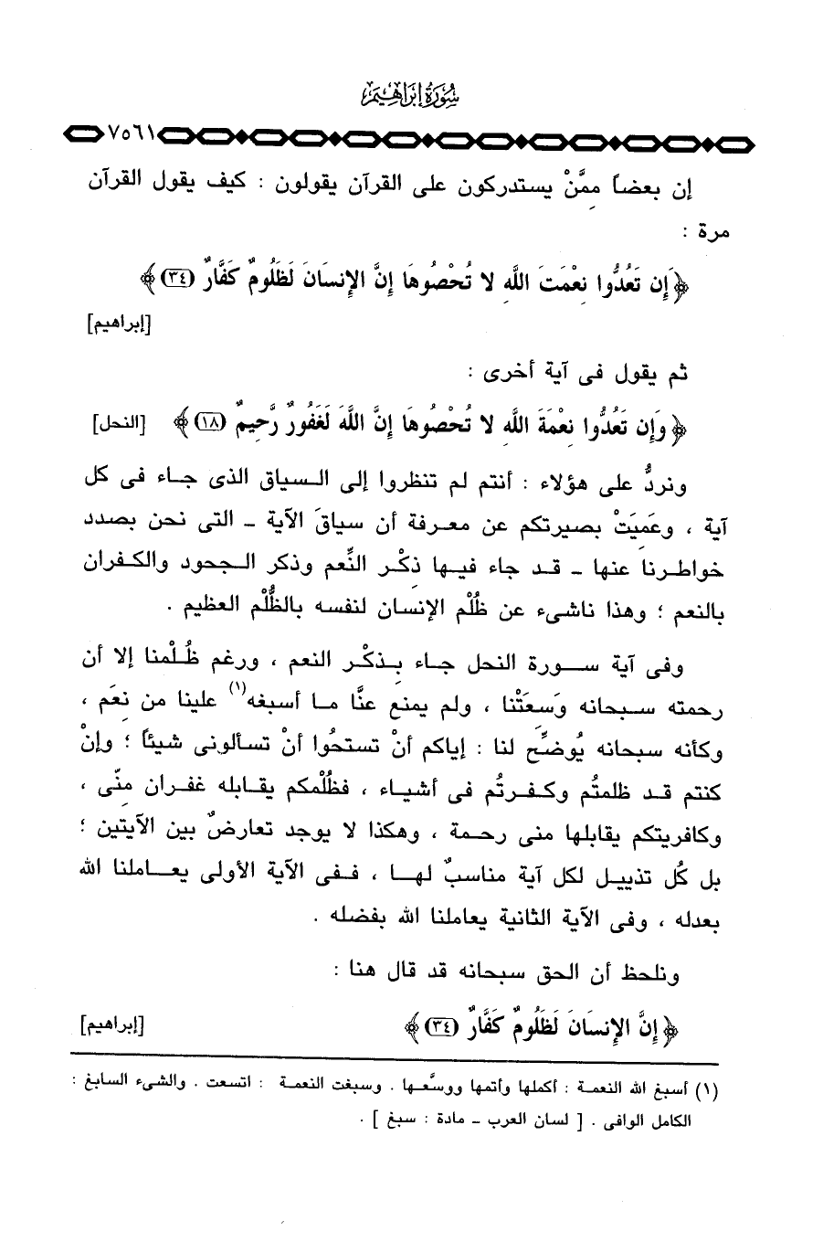 ونردُّ على هؤلاء: أنتم لم تنظروا إلى السياق الذي جاء في كل آية، وعَمِيَتْ بصيرتكم عن معرفة أن سياقَ الآية التي نحن بصدد خواطرنا عنها قد جاء فيها ذِكْر النِّعم وذكر الجحود والكفران بالنعم؛ وهذا ناشىء عن ظُلْم الإنسان لنفسه بالظُّلْم العظيم.