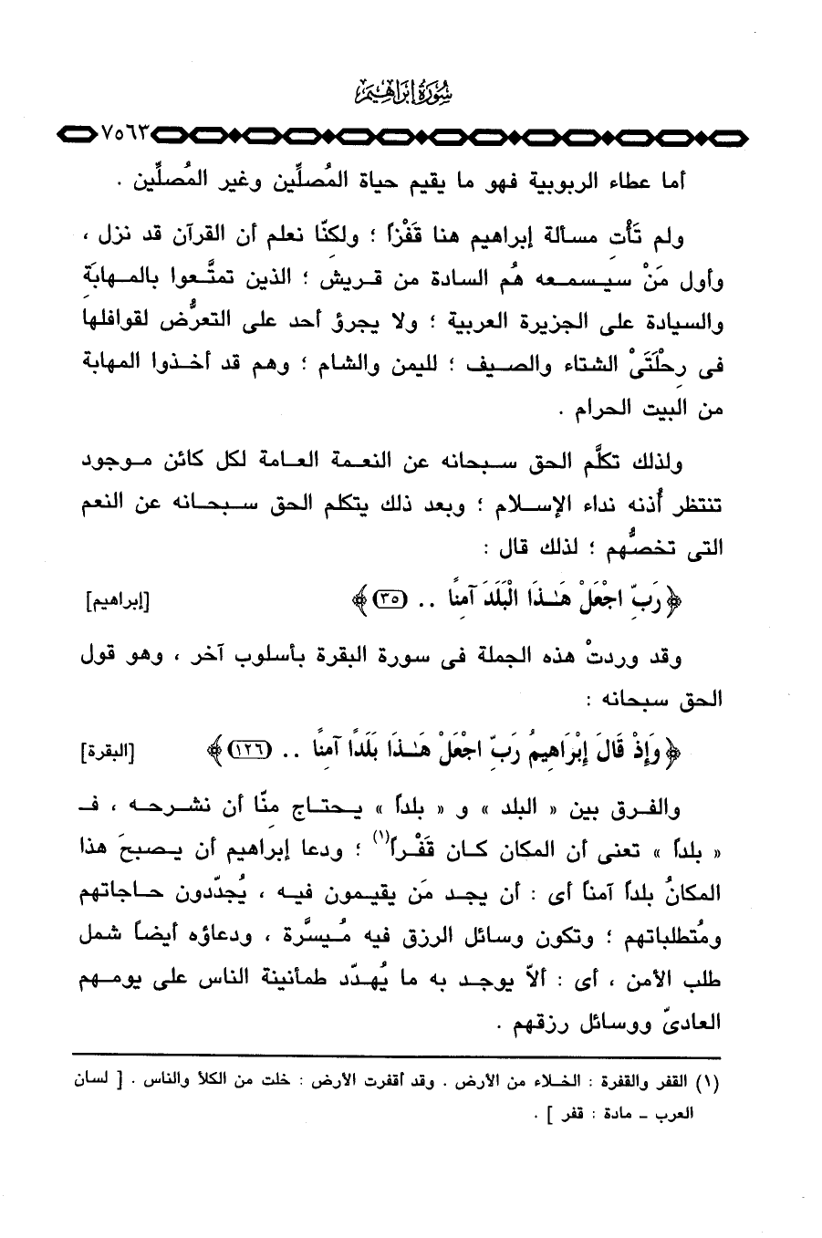 ولم تَأْتِ مسألة إبراهيم هنا قَفْزاً؛ ولكِنّا نعلم أن القرآن قد نزل، وأول مَنْ سيسمعه هُم السادة من قريش؛ الذين تمتَّعوا بالمهابَة والسيادة على الجزيرة العربية؛ ولا يجرؤ أحد على التعرُّض لقوافلها في رِحْلَتَيْ الشتاء والصيف؛ لليمن والشام؛ وهم قد أخذوا المهابة من البيت الحرام.