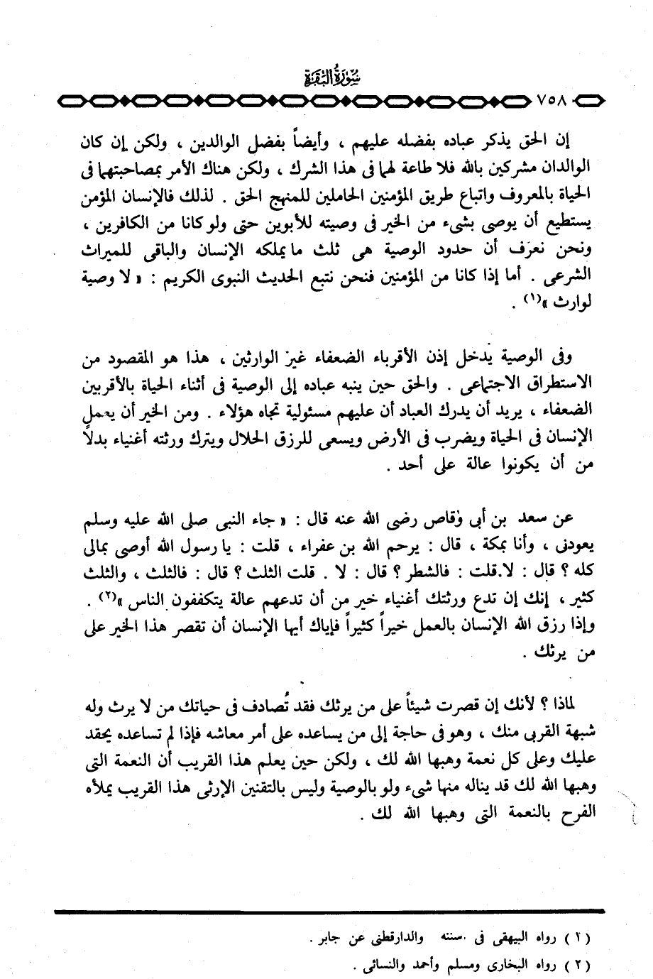 «عن سعد بن أبي وقاص رَضِيَ اللَّهُ عَنْه قال:» جاء النبي صَلَّى اللَّهُ عَلَيْهِ وَسَلَّم َ يعودني، وأنا بمكة، قال: يرحم الله بن عفراء، قلت: يا رسول الله أوصي بمالي كله؟ قال: لا قلت: فالشطر؟ قال: لا. قلت الثلث؟ قال: فالثلث، والثلث كثير، إنك إن تدع ورثتك أغنياء خير من أن تدعهم عالة يتكففون الناس «. وإذا رزق الله الإنسان بالعمل خيراً كثيراً فإياك أيها الإنسان أن تقصر هذا الخير على من يرثك.