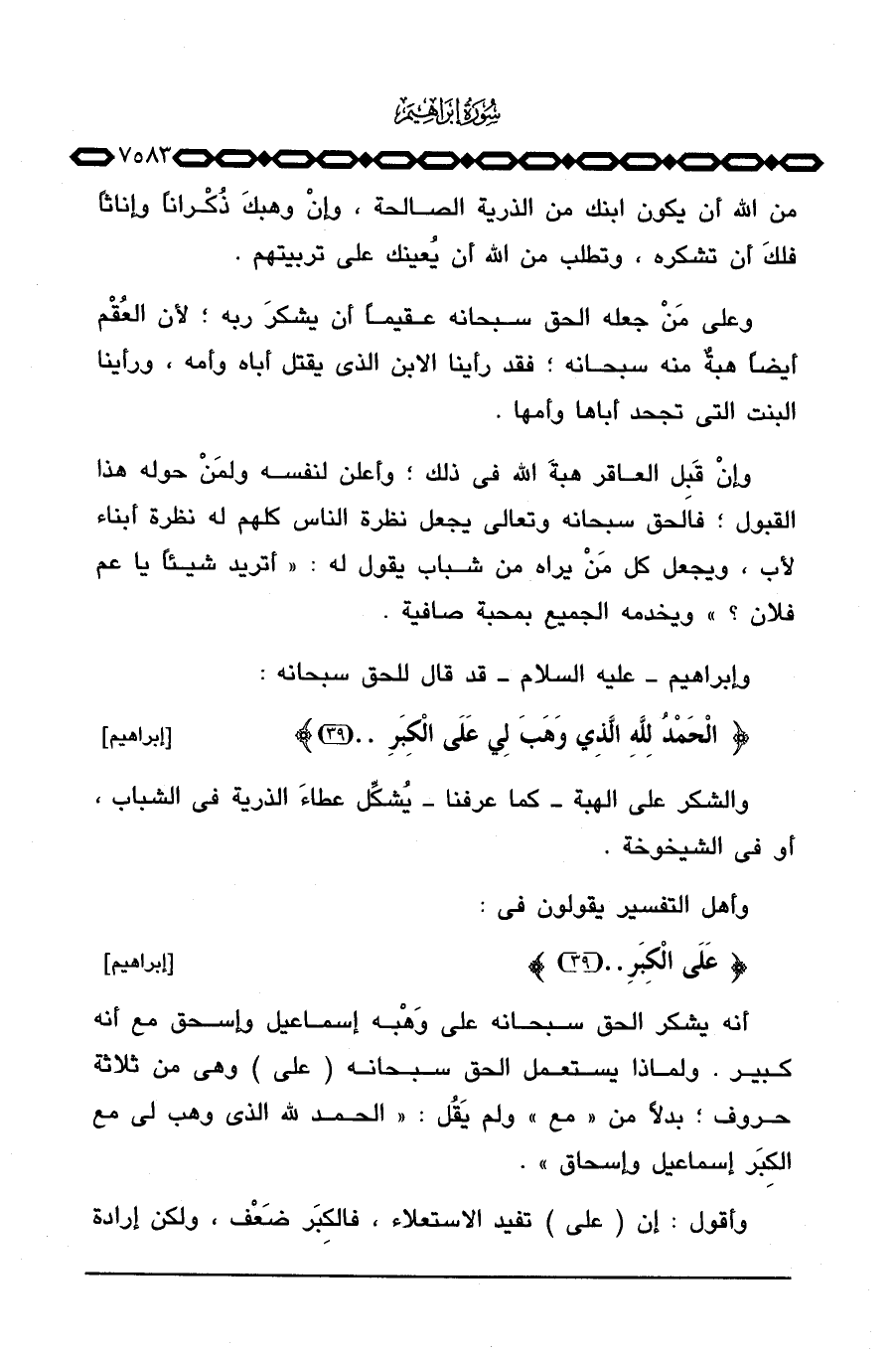 أنه يشكر الحق سبحانه على وَهْبه إسماعيل وإسحق مع أنه كبير. ولماذا يستعمل الحق سبحانه (على) وهي من ثلاثة حروف؛ بدلاً من «مع» ولم يَقُل «الحمد لله الذي وهب لي مع الكِبَر إسماعيل وإسحاق» .
