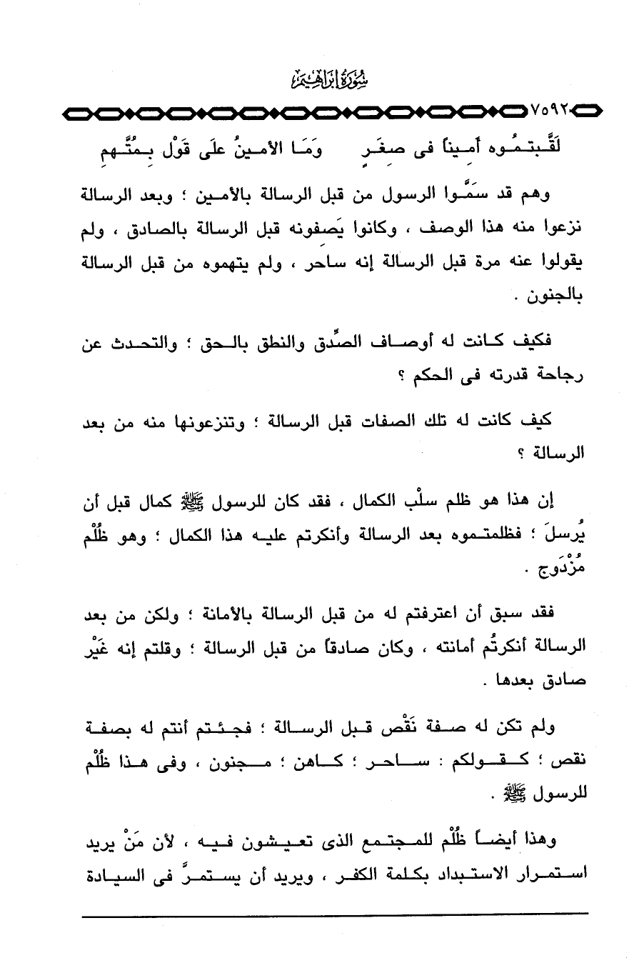 ولم تكن له صفة نَقْص قبل الرسالة؛ فجئتم أنتم له بصفة نقص؛ كقولكم: ساحر؛ كاهن؛ مجنون، وفي هذا ظُلْم للرسول صَلَّى اللَّهُ عَلَيْهِ وَسَلَّم َ.