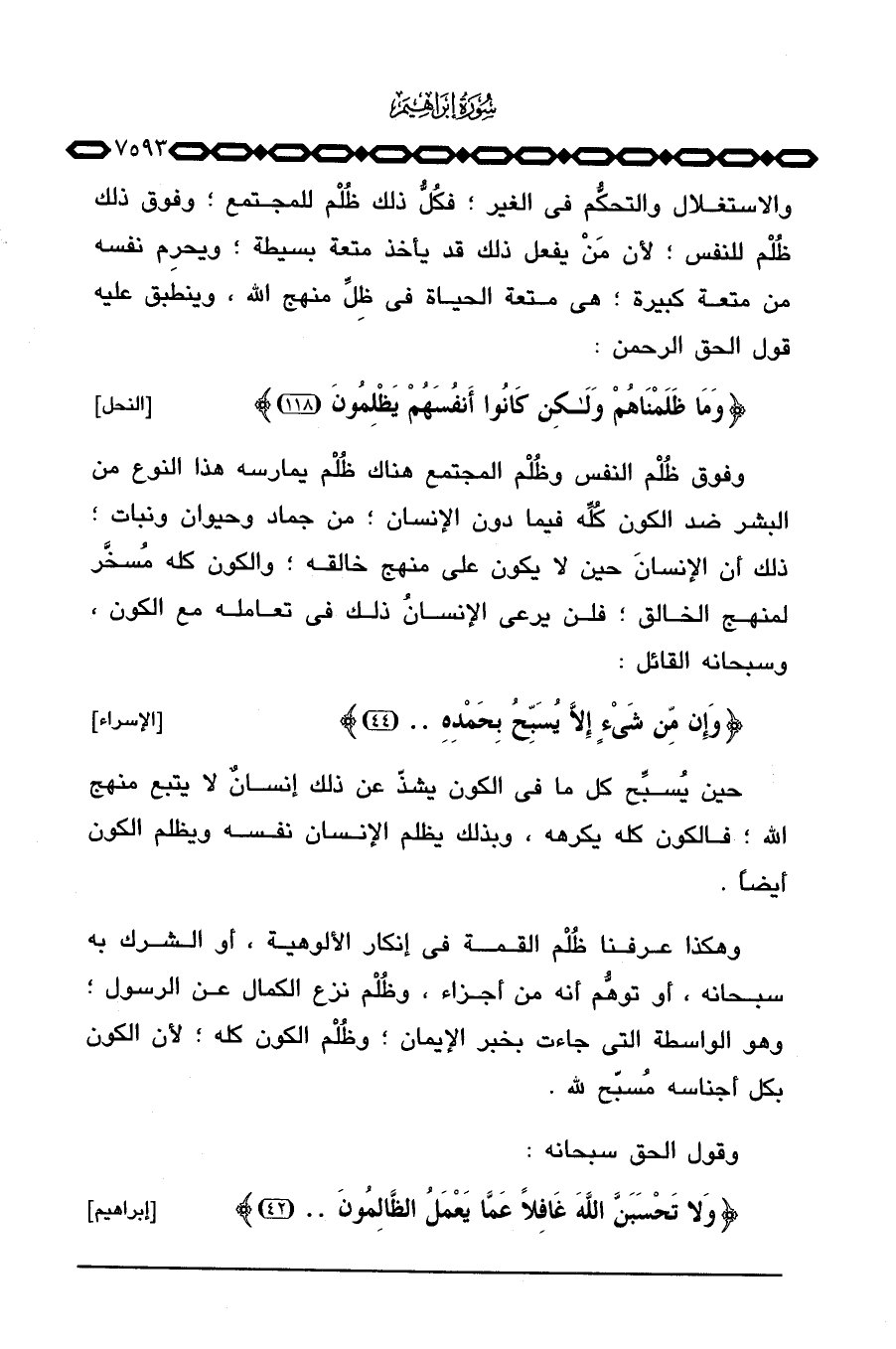 وفوق ظُلْم النفس وظُلْم المجتمع هناك ظُلْم يمارسه هذا النوع من البشر ضد الكون كُلِّه فيما دون الإنسان؛ من جماد وحيوان ونبات؛ ذلك أن الإنسانَ حين لا يكون على منهج خالقه؛ والكون كله مُسخَّر لمنهج الخالق؛ فلن يرعى الإنسانُ ذلك في تعامله مع الكون، وسبحانه القائل: {وَإِن مِّن شَيْءٍ إِلاَّ يُسَبِّحُ بِحَمْدِهِ ... } [الإسراء: 44] .