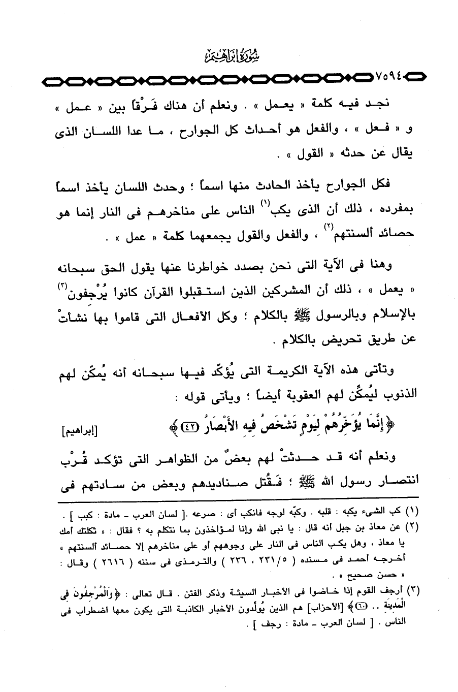 فكل الجوارح يأخذ الحادث منها اسماً؛ وحدث اللسان يأخذ اسماً بمفرده، ذلك أن الذي يكب الناس على مناخرهم في النار إنما هو حصائد ألسنتهم، والفعل والقول يجمعهما كلمة «عمل» .