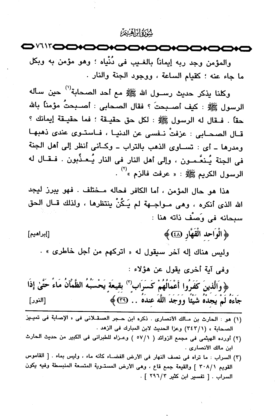 وكلنا يذكر «حديث رسول الله صَلَّى اللَّهُ عَلَيْهِ وَسَلَّم َ مع أحد أصحابه حين سأله الرسول صَلَّى اللَّهُ عَلَيْهِ وَسَلَّم َ: كيف أصبحتَ؟ فقال الصحابي: أصبحت مؤمناً بالله حقاً. فقال له الرسول صَلَّى اللَّهُ عَلَيْهِ وَسَلَّم َ: لكل حق حقيقة؛ فما حقيقة إيمانك؟ قال الصحابي: عزفتْ نفسي عن الدنيا، فاستوى عندي ذهبها ومدرها - أي: تساوي الذهب بالتراب - وكأني أنظر إلى أهل الجنة في الجنة يُنعَّمون، وإلى أهل النار في النار يُعذَّبون. فقال له الرسول الكريم صَلَّى اللَّهُ عَلَيْهِ وَسَلَّم َ:» عرفت فالزم «.