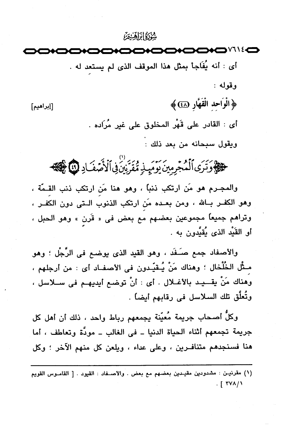 والمجرم هو مَن ارتكب ذنباً، وهو هنا مَنِ ارتكب ذنب القِمّة. وهو الكفر بالله، ومن بعده َمَنِ ارتكب الذنوب اليت دون الكفر، وتراهم جميعاً مجموعين بعضهم مع بعض في «قرنٍ» وهو الحبل أو الَيْد الذي يُقيَّدون.