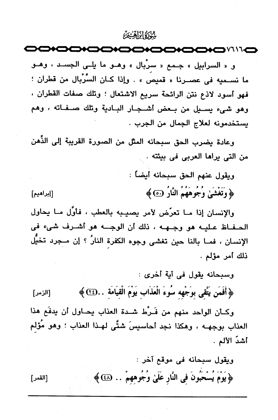و «السرابيل» جمع «سِرْبال» وهو ما يلي الجسد، وهو ما نسميه في عصرنا «قميص» . وإذا كان السِّرْبال من قطران؛ فهو أسود لاذع نتن الرائحة سريع الاشتعال؛ وتلك صفات القطران، وهو شيء يسيل من بعض أشجار البادية وتلك صفاته، وهم يستخدمونه لعلاج الجمال من الجرب.