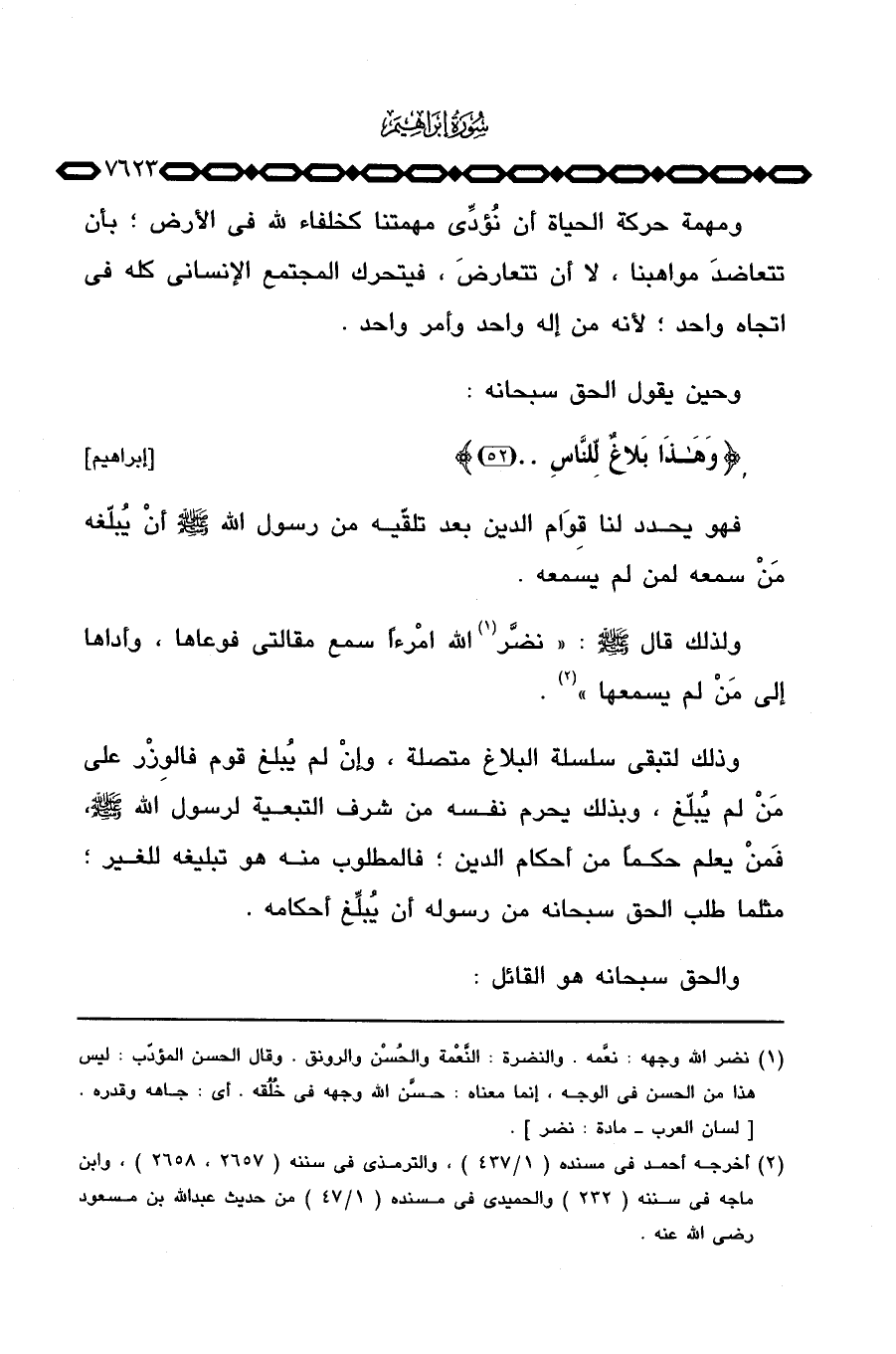 فهو يحدد لنا قِوَام الدين بعد تلقّيه من رسول الله صَلَّى اللَّهُ عَلَيْهِ وَسَلَّم َ أنْ يُبلّغه مَنْ سمعه لمن لم يسمعه.