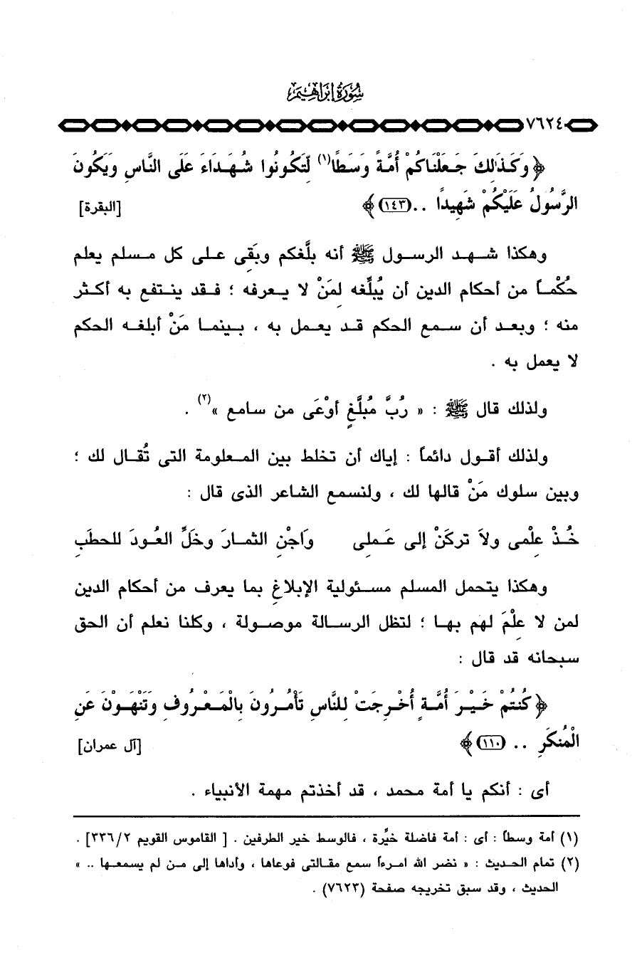 وهكذا يتحمل المسلم مسئولية الإبلاغِ بما يعرف من أحكام الدين لمن لا عِلْمَ لهم بها؛ لتظل الرسالة موصولة، وكلنا نعلم أن الحق سبحانه قد قال: {كُنْتُمْ خَيْرَ أُمَّةٍ أُخْرِجَتْ لِلنَّاسِ تَأْمُرُونَ بالمعروف وَتَنْهَوْنَ عَنِ المنكر ... } [آل عمران: 110] .