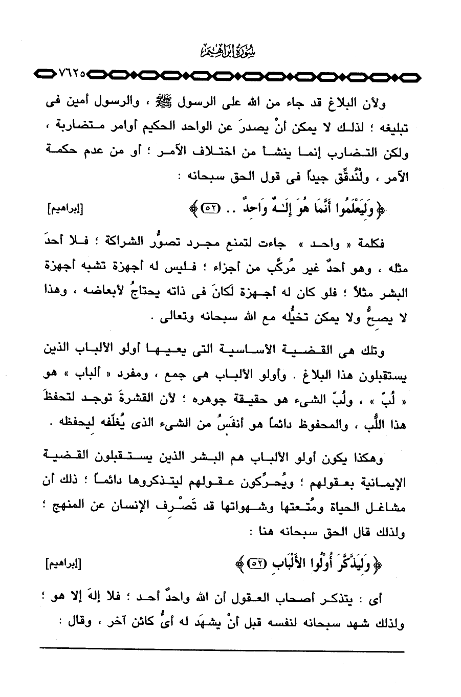 وتلك هي القضية الأساسية التي يعيها أولو الألباب الذين يستقبلون هذا البلاغ. وأولو الألباب هي جمع، ومفرد «ألباب» هو «لُبّ» ، ولُبّ الشيء هو حقيقة جوهره؛ لأن القشرةَ توجد لتحفظَ هذا اللُّب، والمحفوظ دائماً هو أنفَسُ من الشيء الذي يُغلّفه لِيحفظه.