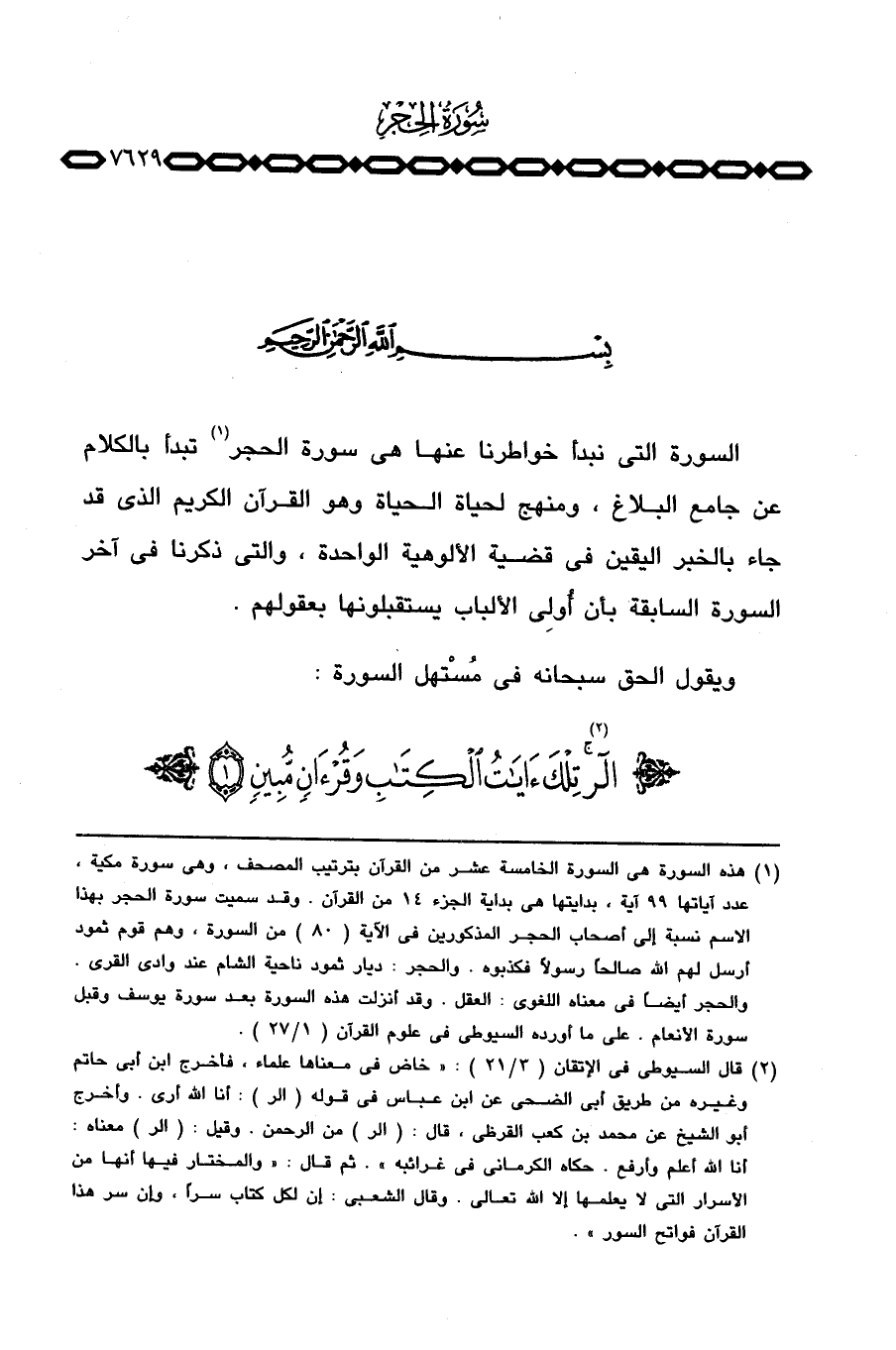 السورة التي نبدأ خواطرنا عنها هي سورة الحجر تبدأ بالكلام عن جامع البلاغ، ومنهج لحياة الحياة وهو القرآن الكريم الذي قد جاء بالخبر اليقين في قضية الألوهية الواحدة، والتي ذكرنا في آخر السورة السابقة بأن أُولِي الألباب يستقبلونها بتعقولهم.