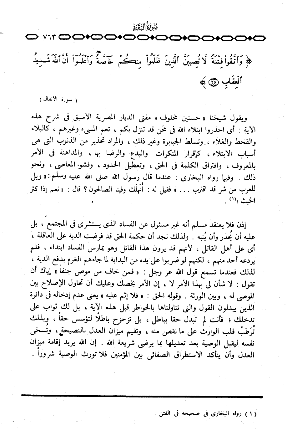 ويقول شيخنا «حسنين مخلوف» مفتي الديار المصرية الأسبق في شرح هذه الآية: أي احذروا ابتلاء الله في محن قد تنزل بكم، تعم المسيء وغيرهم، كالبلاء والقحط والغلاء، وتسلط الجبابرة وغير ذلك، والمراد تحذير من الذنوب التي هي أسباب الابتلاء، كإقرار المنكرات والبدع والرضا بها، والمداهنة في الأمر بالمعروف، وافتراق الكلمة في الحق، وتعطيل الحدود، وفشو المعاصي، ونحو ذلك. وفيما رواه البخاري: عندما قال رسول الله صَلَّى اللَّهُ عَلَيْهِ وَسَلَّم َ: «» ويل للعرب من شر قد اقترب. . «فقيل له: أنهلك وفينا الصالحون؟ قال:» نعم إذا كثر الخبث «» .