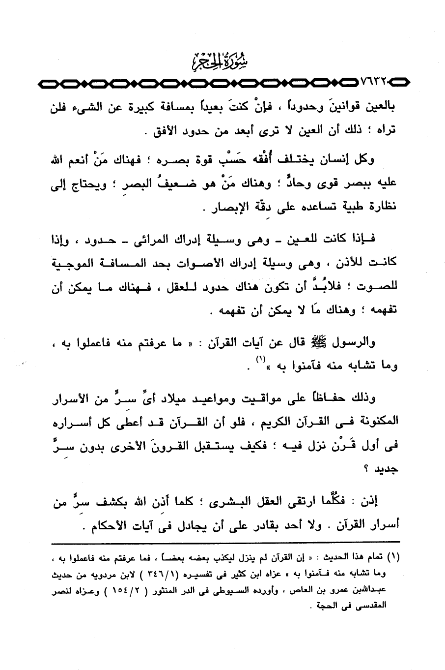 والرسول صَلَّى اللَّهُ عَلَيْهِ وَسَلَّم َ قال عن آيات القرآن: «ما عرفتم منه فاعملوا به، وما تشابه منه فآمنوا به» .