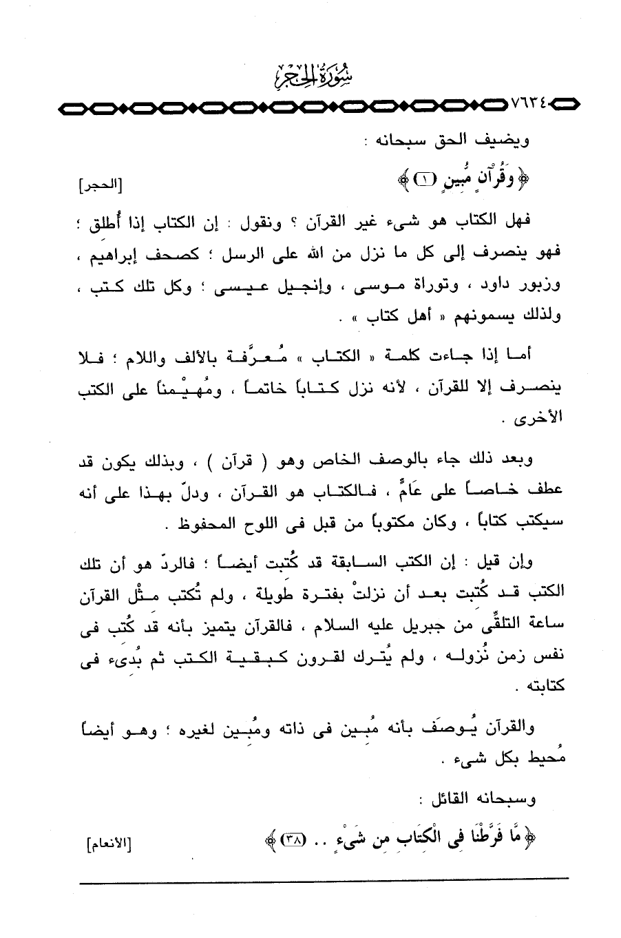 فهل الكتاب هو شيء غير القرآن؟ ونقول: إن الكتاب إذا أُطلِق؛ فهو ينصرف إلى كل ما نزل من الله على الرسل؛ كصحف إبراهيم، وزبور داود، وتوراة موسى، وإنجيل عيسى؛ وكل تلك كتب، ولذلك يسمونهم «أهل الكتاب» .