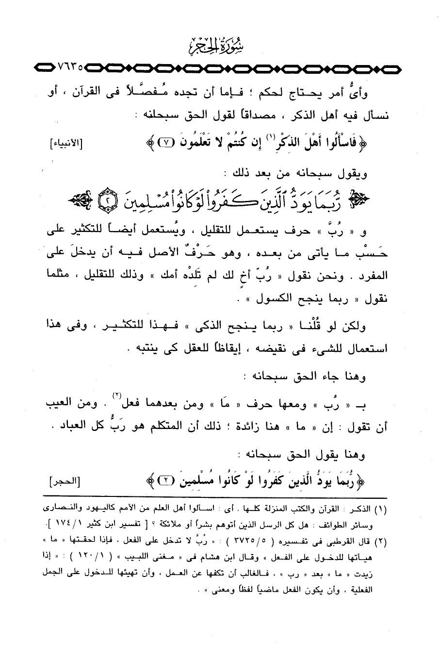 ب «رُب» ومعها حرف «ما» ومن بعدهما فعل. ومن العيب أن تقول: إن «ما» هنا زائدة؛ ذلك أن المتكلم هو ربُّ كل العباد.