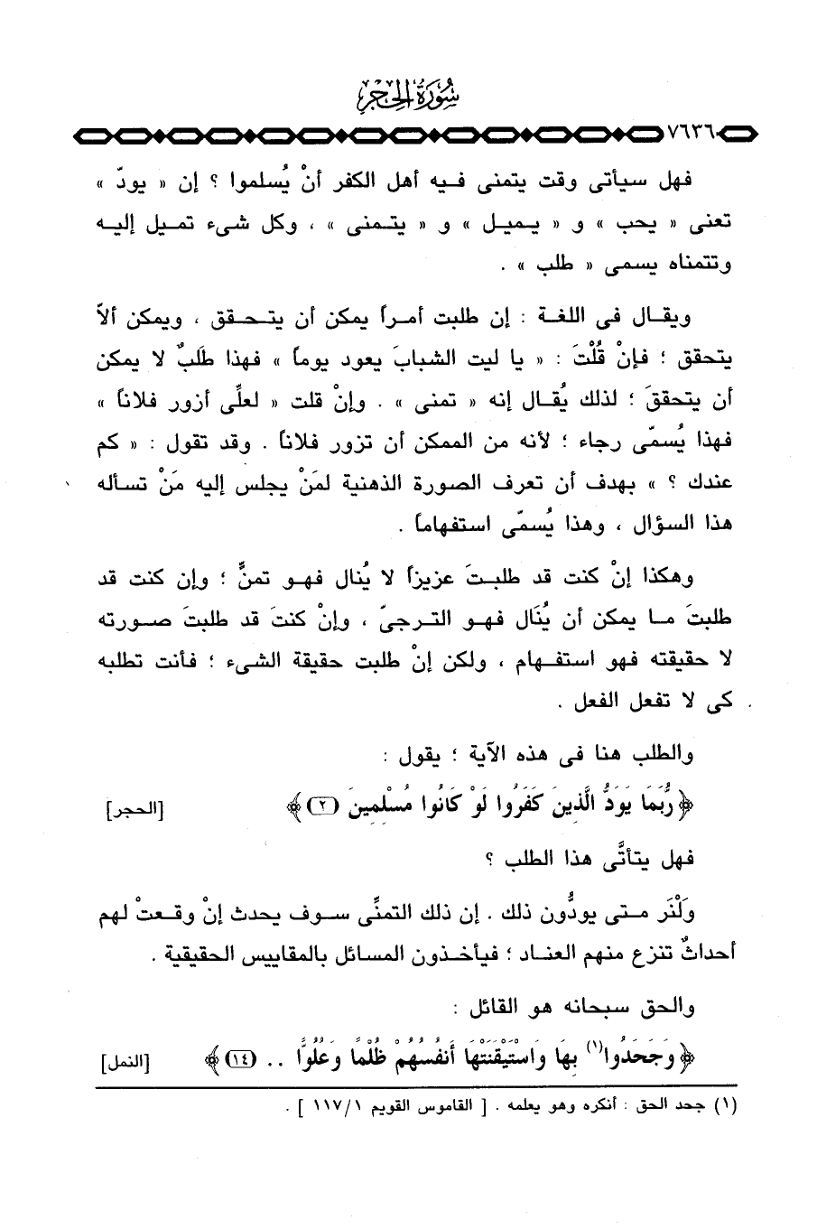 فهل سيأتي وقت يتمنى فيه أهل الكفر أنْ يُسلموا؟ إن «يودّ» تعني «يحب» و «يميل» و «يتمنى» ، وكل شيء تميل إليه وتتمناه يسمى «طلب» .