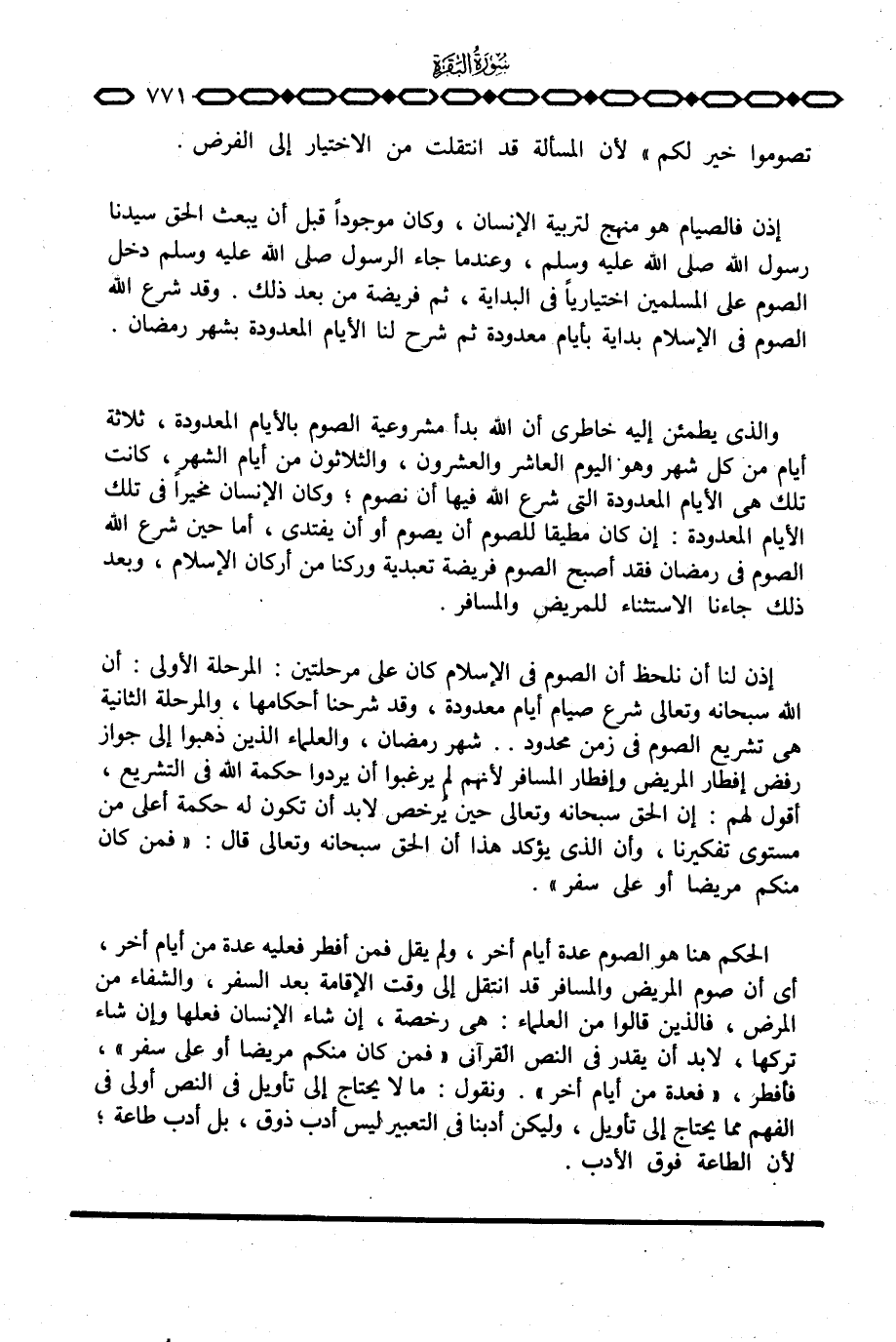 إذن لنا أن نلحظ أن الصوم في الإسلام كان على مرحلتين: المرحلة الأولى: أن الله سبحانه وتعالى شرع صيام أيام معدودة، وقد شرحنا أحكامها، والمرحلة الثانية هي تشريع الصوم في زمن محدود. . شهر رمضان، والعلماء الذين ذهبوا إلى جواز رفض إفطار المريض وإفطار المسافر لأنهم لم يرغبوا أن يردوا حكمة الله في التشريع، أقول لهم: إن الحق سبحانه وتعالى حين يرخص لابد أن تكون له حكمة أعلى من مستوى تفكيرنا، وأن الذي يؤكد هذا أن الحق سبحانه وتعالى قال: {وَمَن كَانَ مَرِيضاً أَوْ على سَفَرٍ فَعِدَّةٌ مِّنْ أَيَّامٍ أُخَرَ} .