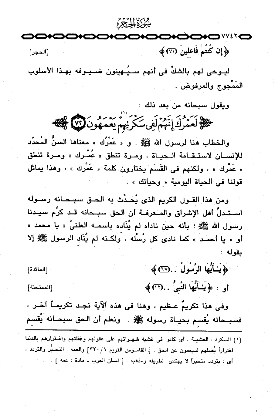 والخطاب هنا لرسول الله صَلَّى اللَّهُ عَلَيْهِ وَسَلَّم َ. و «عَمْرُك» معناها السنُّ المُحدَّد للإنسان لاستقامة الحياة، ومرة تنطق «عُمْرك» ومرة تنطق «عَمْرك» ، ولكنهم في القَسَم يختارون كلمة «عَمْرك» ، وهذا يماثل قولنا في الحياة اليومية «وحياتك» .