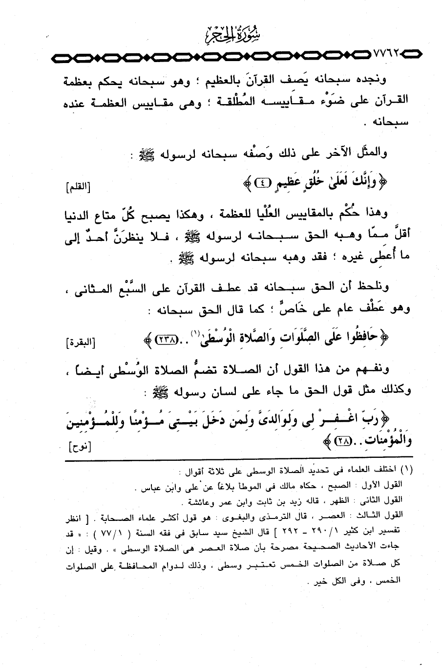 ونفهم من هذا القول أن الصلاة تضمُّ الصلاة الوُسْطى أيضاً، وكذلك مثل قول الحق ما جاء على لسان رسوله صَلَّى اللَّهُ عَلَيْهِ وَسَلَّم َ: {رَّبِّ اغفر لِي وَلِوَالِدَيَّ وَلِمَن دَخَلَ بَيْتِيَ مُؤْمِناً وَلِلْمُؤْمِنِينَ والمؤمنات} [نوح: 28] .