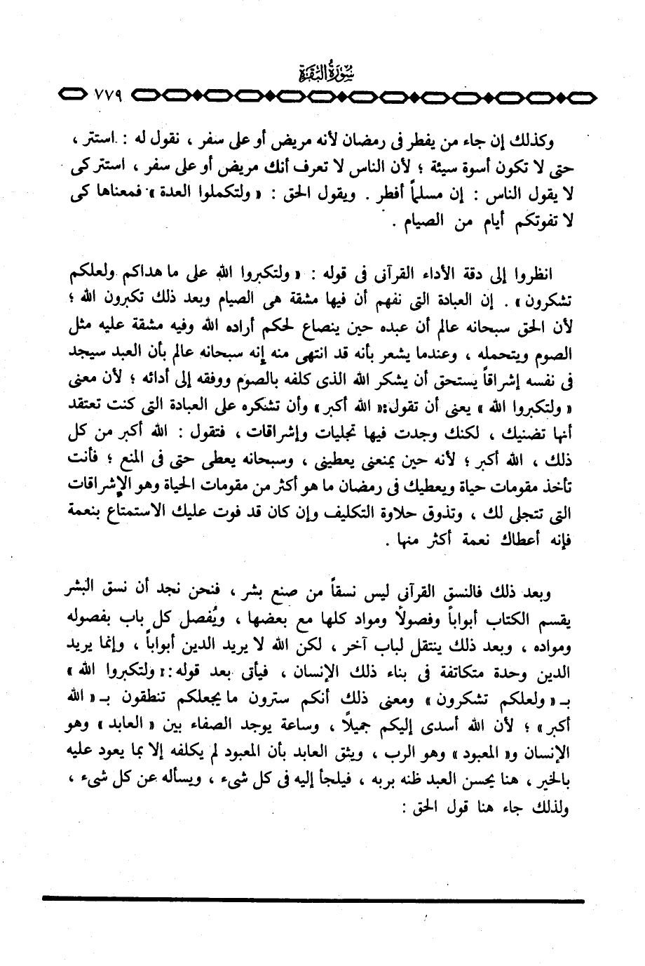 وبعد ذلك فالنسق القرآني ليس نسقاً من صنع البشر، فنحن نجد أن نسق البشر يقسم الكتاب أبواباً وفصولاً ومواد كلها مع بعضها، ويُفصل كل باب بفصوله ومواده، وبعد ذلك ينتقل لباب آخر، لكن الله لا يريد الدين أبواباً، وإنما يريد الدين وحدة متكاتفة في بناء ذلك الإنسان، فيأتي بعد قوله: {وَلِتُكَبِّرُواْ الله} ب {وَلَعَلَّكُمْ تَشْكُرُونَ} ومعنى ذلك أنكم سترون ما يجعلكم تنطقون ب «الله أكبر» ؛ لأن الله أسدى إليكم جميلاً، وساعة يوجد الصفاء بين «العابد» وهو الإنسان و «المعبود» وهو الرب، ويثق العابد بأن المعبود لم يكلفه إلا بما يعود عليه بالخير، هنا يحسن العبد ظنه بربه، فيلجأ إليه في كل شيء، ويسأله عن كل شيء، ولذلك جاء هنا قول الحق: