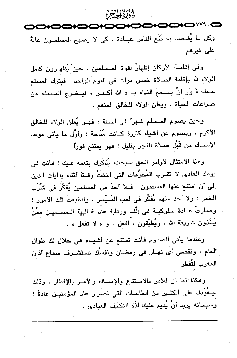 وفي إقامة الأركان إظهارٌ لقوة المسلمين، حين يُظهِرون كامل الولاء لله بإقامة الصلاة خمس مرات في اليوم الواحد، فيترك المسلم عمله فَوْر أنْ يسمع النداء ب «الله أكبر» فيخرج المسلم من صراعات الحياة، ويعلن الولاء للخالق المنعم.