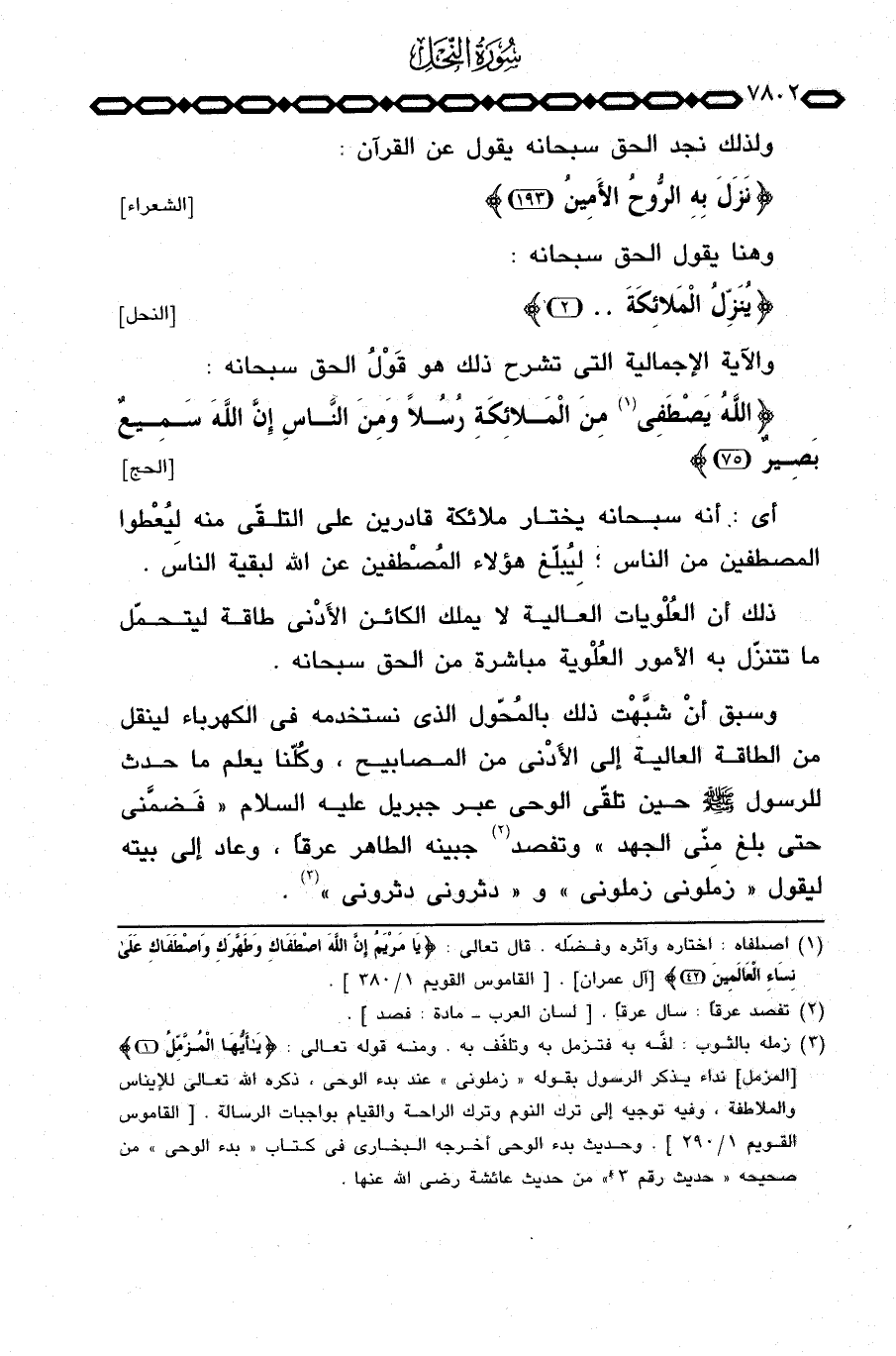 وسبق أنْ شبَّهتْ ذلك بالمُحوّل الذي نستخدمه في الكهرباء لينقل من الطاقة العالية إلى الأَدْنى من المصابيح، «وكُلّنا يعلم ما حدث للرسول صَلَّى اللَّهُ عَلَيْهِ وَسَلَّم َ حين تلقَّى الوحي عبر جبريل عليه السلام» فَضمَّني حتى بلغ مِنَّي الجهد «وتفصد جبينه الطاهر عرقاً، وعاد إلى بيته ليقول» زملوني زملوني «و» دثروني دثروني «.