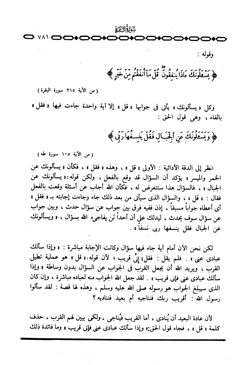 وكل {يَسْأَلُونَكَ} يأتي في جوابها {قُلْ} إلا آية واحدة جاءت فيها «فقل» بالفاء، وهي قول الحق: {وَيَسْأَلُونَكَ عَنِ الجبال فَقُلْ يَنسِفُهَا رَبِّي نَسْفاً} [طه: 105]