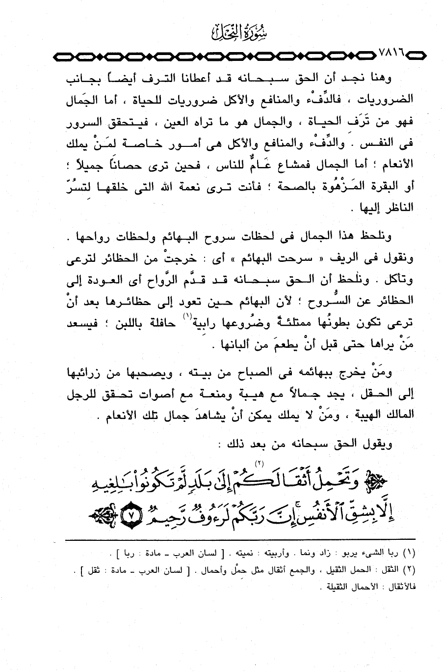 وهنا نجد أن الحق سبحانه قد أعطانا الترف أيضاً بجانب الضروريات، فالدِّفْء والمنافع والأكل ضروريات للحياة، أما الجَمال فهو من تَرَف الحياة، والجمال هو ما تراه العين، فيتحقق السرور في النفس. والدِّفْء والمنافع والأكل هي أمور خاصة لِمَنْ يملك الأنعام؛ أما الجمال فمشاع عَامٌّ للناس، فحين ترى حصاناً جميلاً؛ أو البقرة المَزْهُوة بالصحة؛ فأنت ترى نعمة الله التي خلقها لِتسُرّ الناظر إليها.