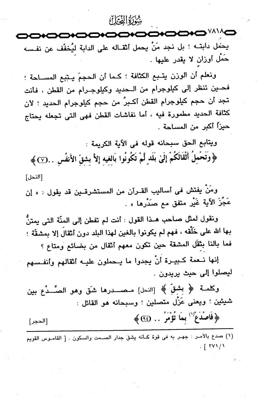 ونعلم أن الوزن يتبع الكثافة؛ كما أن الحجمَ يتبع المساحة؛ فحين تنظر إلى كيلوجرام من القطن، فأنت تجد حجم كيلوجرام القطن أكبرُ من حجم الحديد؛ لأن كثافة الحديد مطمورة فيه، أما نفاشات القطن فهي التي تجعله يحتاج حيزاً اكبر من المساحة.