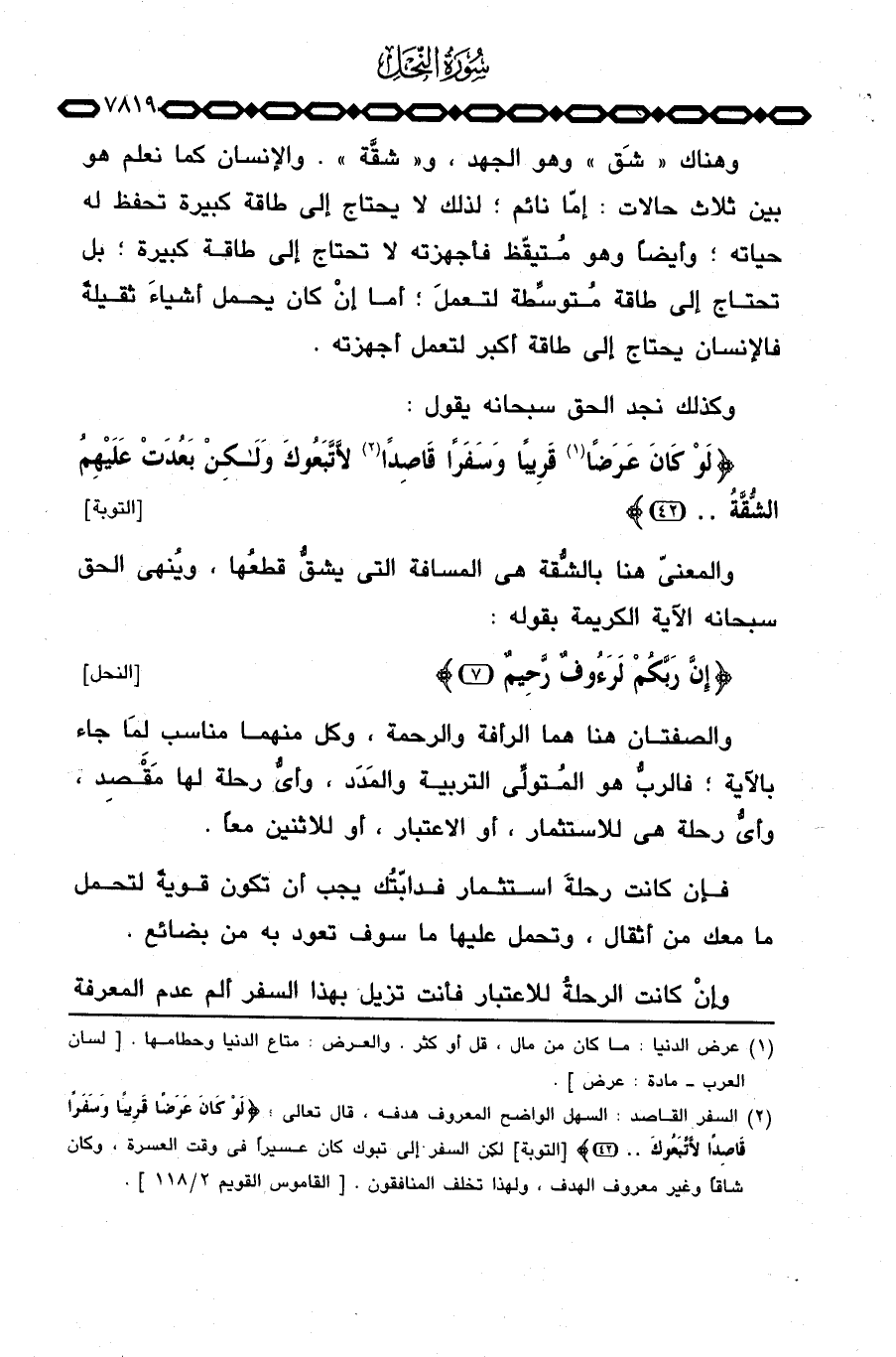 وهناك «شَق» وهو الجهد، و «شقَّة» . والإنسان كما نعلم هو بين ثلاث حالات: إمَّا نائم؛ لذلك لا يحتاج إلى طاقة كبيرة تحفظ له حياته؛ وأيضاً وهو مُتيقِّظ فأجهزته لا تحتاج إلى طاقة كبيرة؛ بل تحتاج إلى طاقة مُتوسِّطة لتعملَ؛ أما إنْ كان يحمل أشياءَ ثقيلة فالإنسان يحتاج إلى طاقة أكبر لتعمل أجهزته.