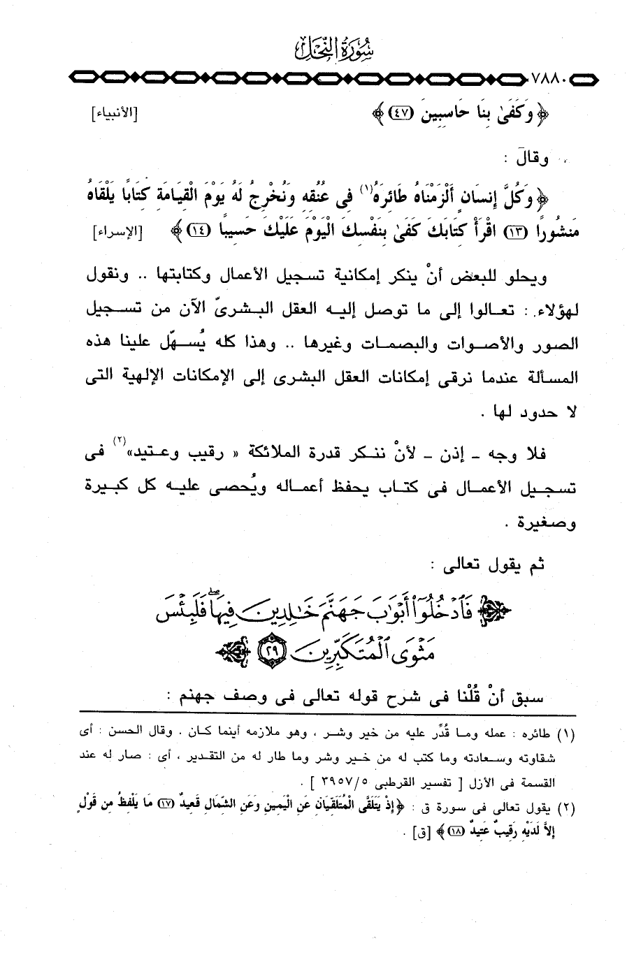 وقال: {وَكُلَّ إِنْسَانٍ أَلْزَمْنَاهُ طَآئِرَهُ فِي عُنُقِهِ وَنُخْرِجُ لَهُ يَوْمَ القيامة كِتَاباً يَلْقَاهُ مَنْشُوراً اقرأ كتابك كفى بِنَفْسِكَ اليوم عَلَيْكَ حَسِيباً} [الإسراء: 13 - 14] .