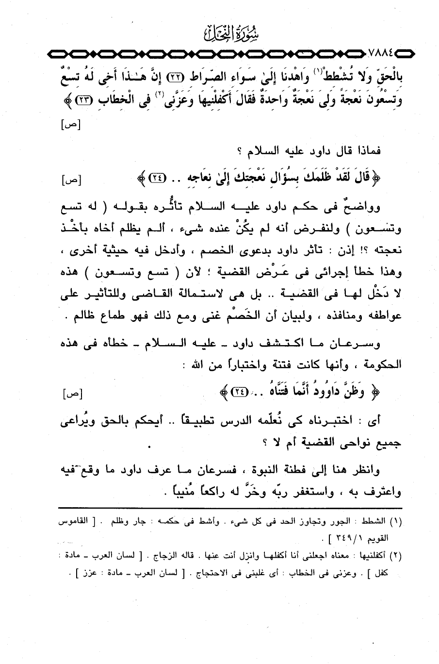 بالحق وَلاَ تُشْطِطْ واهدنآ إلى سَوَآءِ الصراط إِنَّ هَذَآ أَخِي لَهُ تِسْعٌ وَتِسْعُونَ نَعْجَةً وَلِي نَعْجَةٌ وَاحِدَةٌ فَقَالَ أَكْفِلْنِيهَا وَعَزَّنِي فِي الخطاب} [ص: 21 - 23] .