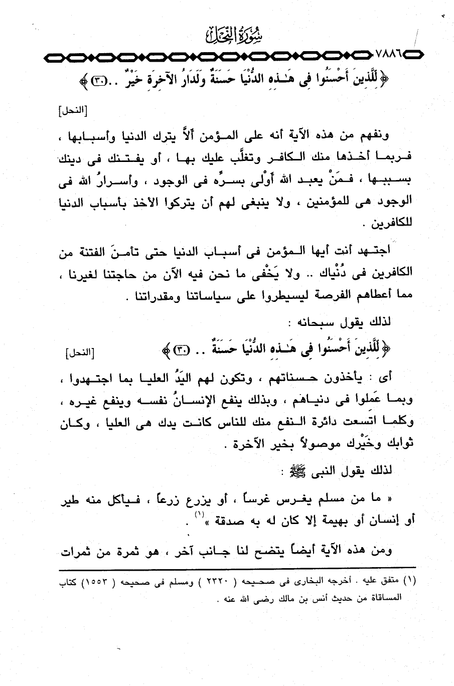 لذلك يقول النبي صَلَّى اللَّهُ عَلَيْهِ وَسَلَّم َ: «ما من مسلم يغرس غرساً، أو يزرع زرعاً، فيأكل منه طير أو إنسان أو بهيمة إلا كان له به صدقة» .