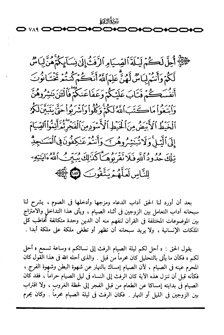 بعد أن أورد لنا الحق آداب الدعاء ومزجها وأدخلها في الصوم، يشرح لنا سبحانه آداب التعامل بين الزوجين في أثناء الصيام، ويأتي هذا التداخل والامتزاج بين الموضوعات المختلفة في القرآن لنفهم منه أن الدين وحدة متكاتفة تُخاطب كل الملكات الإنسانية، ولا يريد سبحانه أن تظهر أو تطغى ملكة على ملكة أبدا.