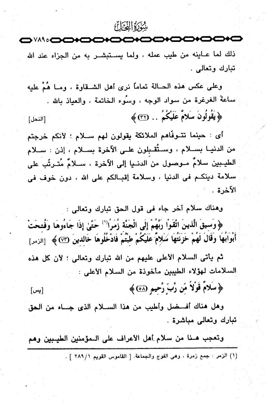 وهنا سلام آخر جاء في قول الحق تبارك وتعالى: {وَسِيقَ الذين اتقوا رَبَّهُمْ إِلَى الجنة زُمَراً حتى إِذَا جَآءُوهَا وَفُتِحَتْ أَبْوَابُهَا وَقَالَ لَهُمْ خَزَنَتُهَا سَلاَمٌ عَلَيْكُمْ طِبْتُمْ فادخلوها خَالِدِينَ}