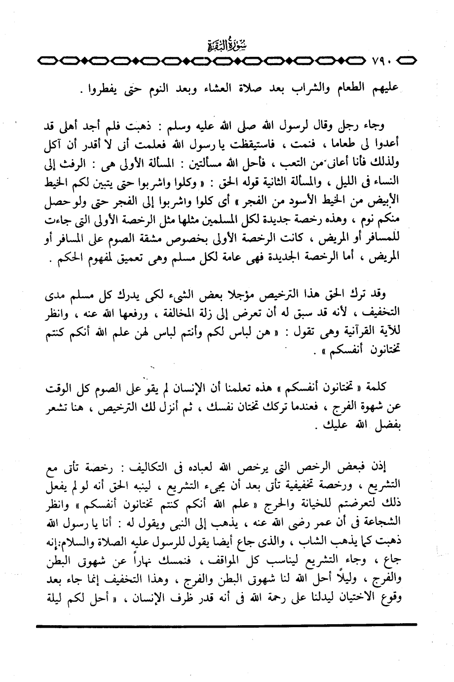 وجاء رجل وقال لرسول الله صَلَّى اللَّهُ عَلَيْهِ وَسَلَّم َ: ذهبت فلم أجد أهلي قد أعدوا لي طعاما، فنمت، فاستيقظت يا رسول الله فعلمت أني لا أقدر أن آكل ولذلك فأنا أعاني من التعب، فأحل الله مسألتين: المسألة الأولى هي: الرفث إلى النساء في الليل، والمسألة الثانية قوله الحق: {وَكُلُواْ واشربوا حتى يَتَبَيَّنَ لَكُمُ الخيط الأبيض مِنَ الخيط الأسود مِنَ الفجر} أي كلوا واشربوا إلى الفجر حتى ولو حصل منكم نوم، وهذه رخصة جديدة لكل المسلمين مثلها مثل الرخصة الأولى التي جاءت للمسافر أو المريض، كانت الرخصة الأولى بخصوص مشقة الصوم على المسافر أو المريض، أما الرخصة الجديدة فهي عامة لكل مسلم وهي تعميق لمفهوم الحكم.