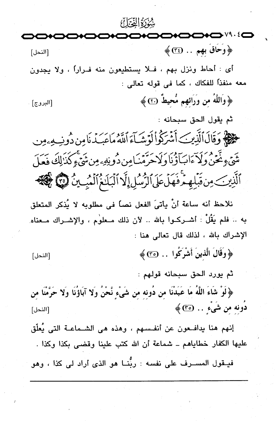 {لَوْ شَآءَ الله مَا عَبَدْنَا مِن دُونِهِ مِن شَيْءٍ نَّحْنُ ولا آبَاؤُنَا وَلاَ حَرَّمْنَا مِن دُونِهِ مِن شَيْءٍ} [النحل: 35] .