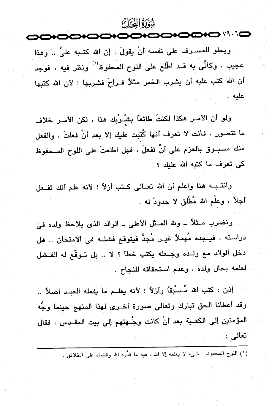 ويحلو للمسرف على نفسه أنْ يقولَ: إن الله كتبه عليَّ. . وهذا عجيب، وكأنِّي به قد اطَّلع على اللوح المحفوظ ونظر فيه، فوجد أن الله كتب عليه أن يشرب الخمر مثلاً فراحَ فشربها؛ لأن الله كتبها عليه.