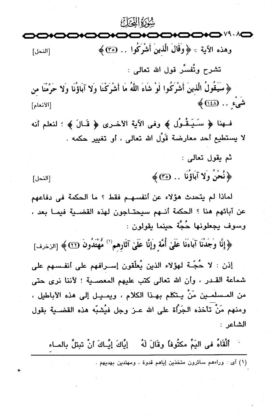 تشرح وتُفسِّر قول الله تعالى: {سَيَقُولُ الذين أَشْرَكُواْ لَوْ شَآءَ الله مَآ أَشْرَكْنَا وَلاَ آبَاؤُنَا وَلاَ حَرَّمْنَا مِن شَيْءٍ} [الأنعام: 148] .