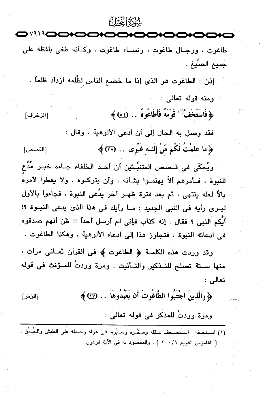 وقد وردت هذه الكلمة {الطاغوت} في القرآن ثماني مرات، منها ستة تصلح للتذكير والتأنيث، ومرة وردتْ للمؤنث في قوله تعالى: {والذين اجتنبوا الطاغوت أَن يَعْبُدُوهَا. .} [الزمر: 17] .