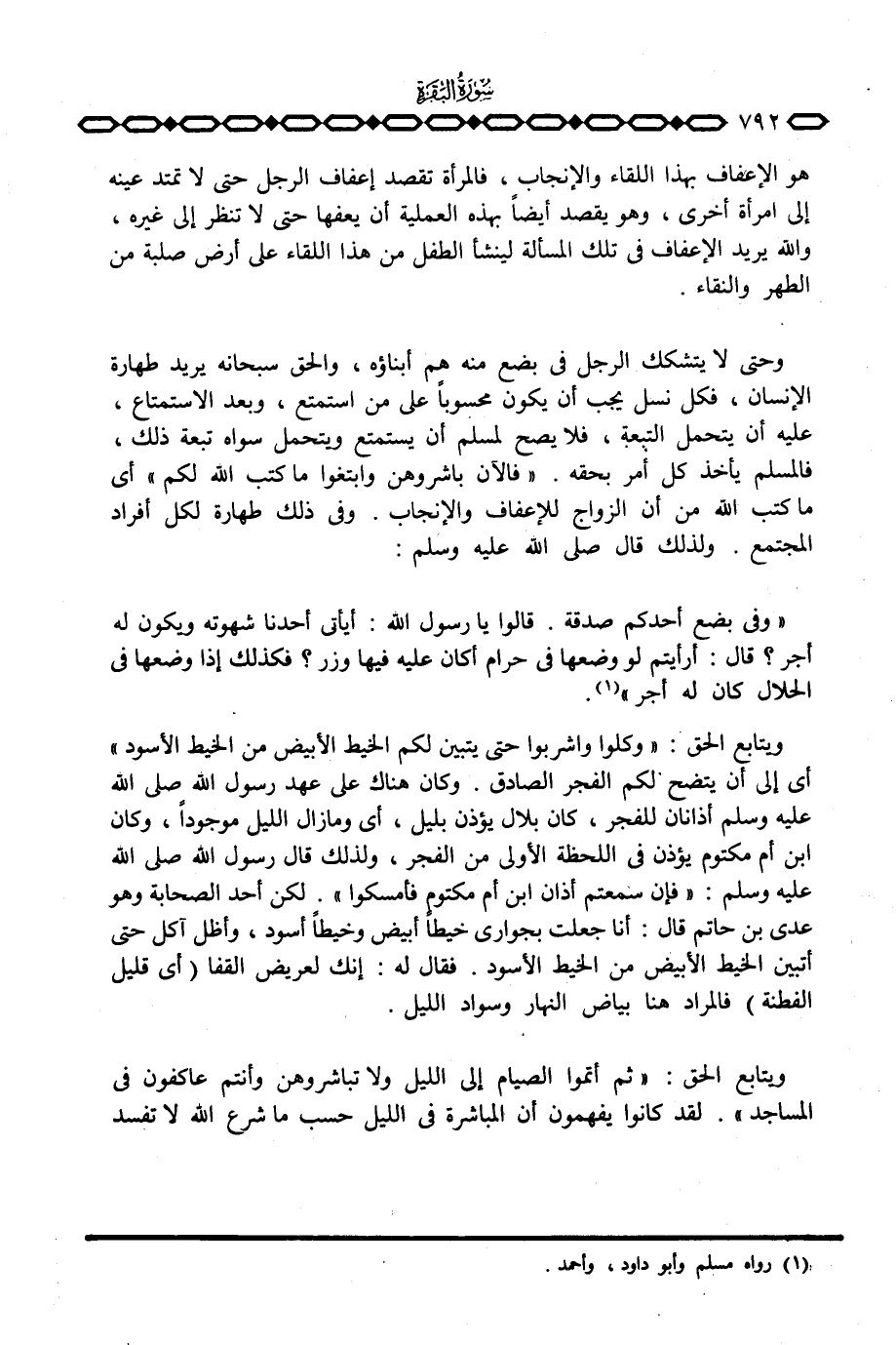 ويتابع الحق: {وَكُلُواْ واشربوا حتى يَتَبَيَّنَ لَكُمُ الخيط الأبيض مِنَ الخيط الأسود} أي إلى أن يتضح لكم الفجر الصادق. وكان هناك على عهد رسول الله صَلَّى اللَّهُ عَلَيْهِ وَسَلَّم َ أذانان للفجر، كان بلال يؤذن بليل، أي ومازال الليل موجوداً، وكان ابن أم مكتوم يؤذن في اللحظة الأولى من الفجر، ولذلك قال رسول الله صَلَّى اللَّهُ عَلَيْهِ وَسَلَّم َ: «فإن سمعتم أذان ابن أم مكتوم فأمسكوا» . لكن أحد الصحابة وهو عدي بن حاتم قال: أنا جعلت بجواري خيطا أبيض وخيطاً أسود، وأظل آكل حتى أتبين الخيط الأبيض من الخيط الأسود. فقال له: إنك لعريض القفا (أي قليل الفطنة) فالمراد هنا بياض النهار وسواد الليل.