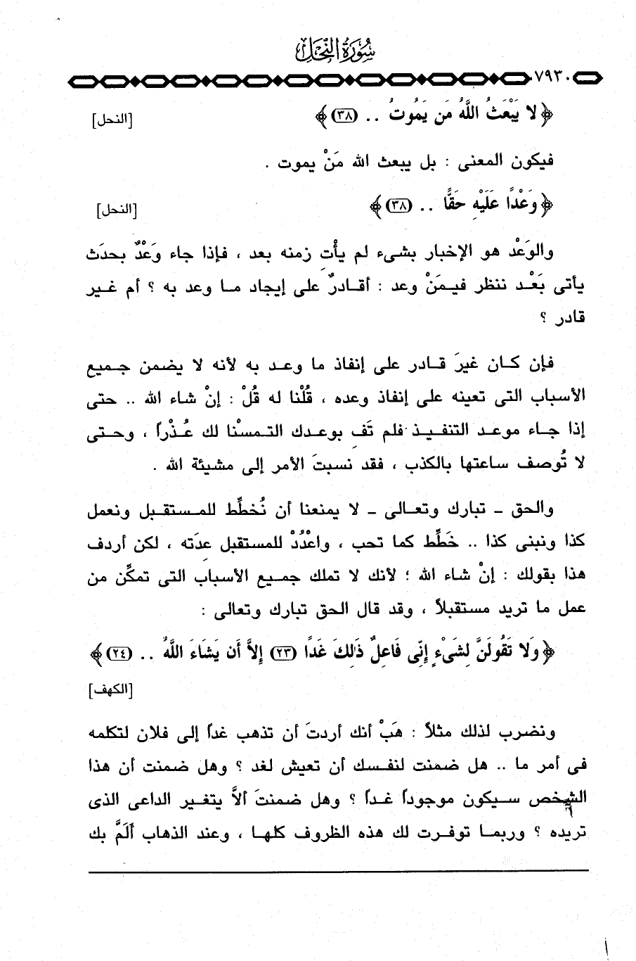 ونضرب لذلك مثلاً: هَبْ أنك أردتَ أن تذهب غداً إلى فلان لتكلمه في أمر ما. . هل ضمنت لنفسك أن تعيش لغد؟ وهل ضمنت أن هذا الشخص سيكون موجوداً غداً؟ وهل ضمنتَ ألا يتغير الداعي الذي تريده؟ وربما توفرت لك هذه الظروف كلها، وعند الذهاب أَلَمَّ بك