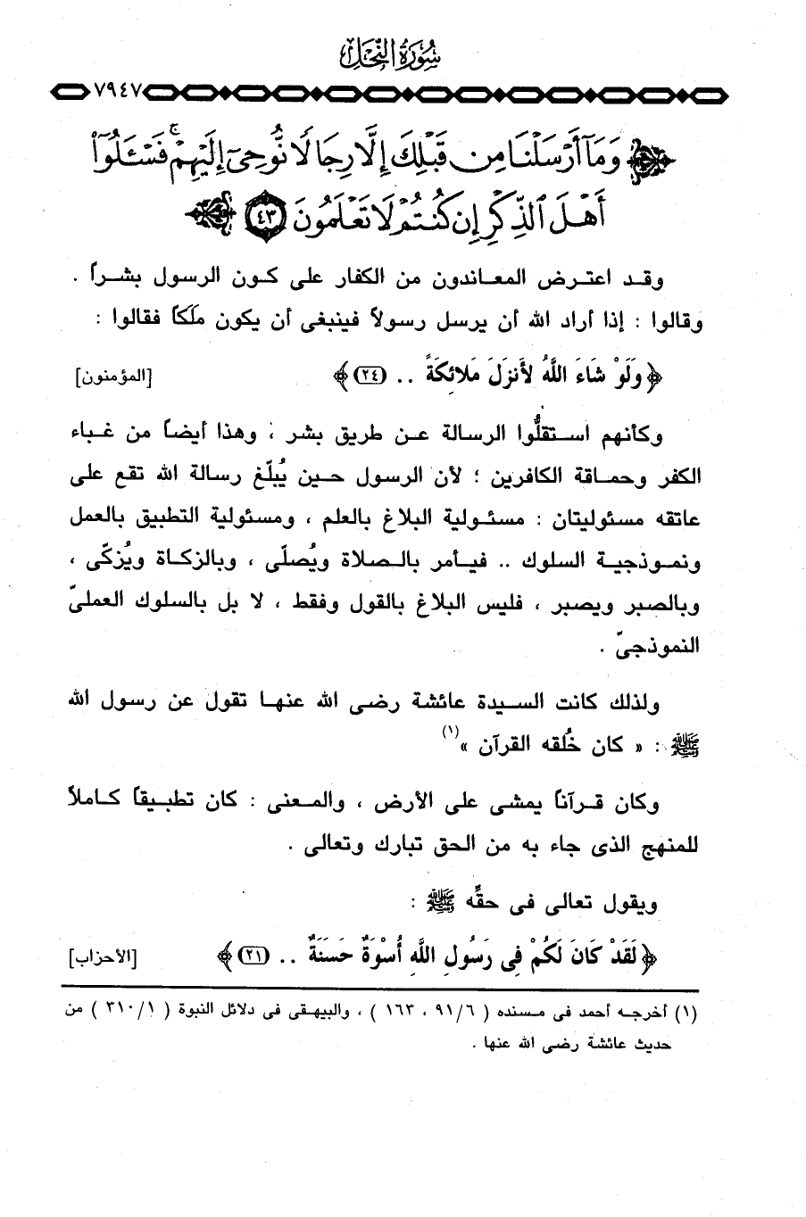 ولذلك كانت السيدة عائشة رَضِيَ اللَّهُ عَنْها تقول عن رسول الله صَلَّى اللَّهُ عَلَيْهِ وَسَلَّم َ: «كان خلقه القرآن» .