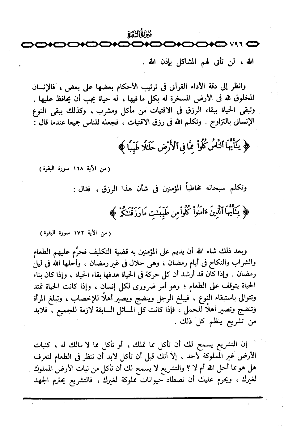 وإذا كان قد أرشد أن كل حركة في الحياة هدفها بقاء الحياة، وإذا كان بناء الحياة يتوقف على الطعام؛ وهو أمر ضروري لكل إنسان، وإذا كانت الحياة تمتد وتتوالى باستبقاء النوع، فيبلغ الرجل وينضج ويصير أهلاً للإخصاب، وتبلغ المرأة وتنضج وتصير أهلاً للحمل، فإذا كانت كل المسائل السابقة لازمة للجميع، فلابد من تشريع ينظم كل ذلك.
