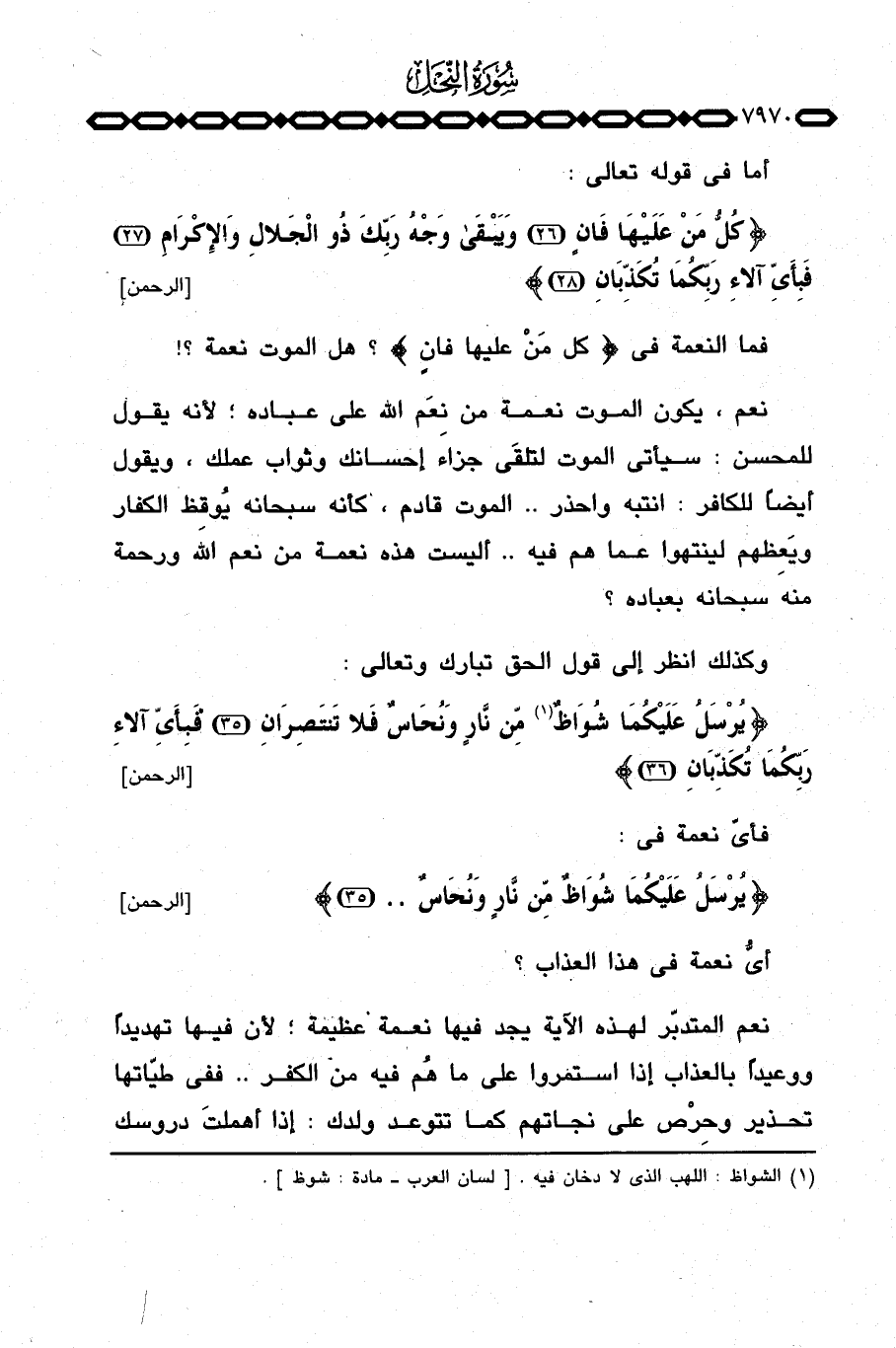 أما في قوله تعالى: {كُلُّ مَنْ عَلَيْهَا فَانٍ ويبقى وَجْهُ رَبِّكَ ذُو الجلال والإكرام فَبِأَيِّ آلاء رَبِّكُمَا تُكَذِّبَانِ} [الرحمن: 26 - 28] .