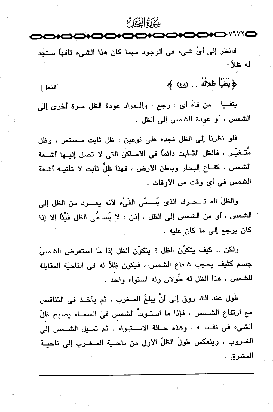 والظلّ المتحرك الذي يُسمّى الفَيْء لأنه يعود من الظل إلى الشمس، أو من الشمس إلى الظل، إذن: لا يُسمَّى الظل فَيْئاً إلا إذا كان يرجع إلى ما كان عليه.
